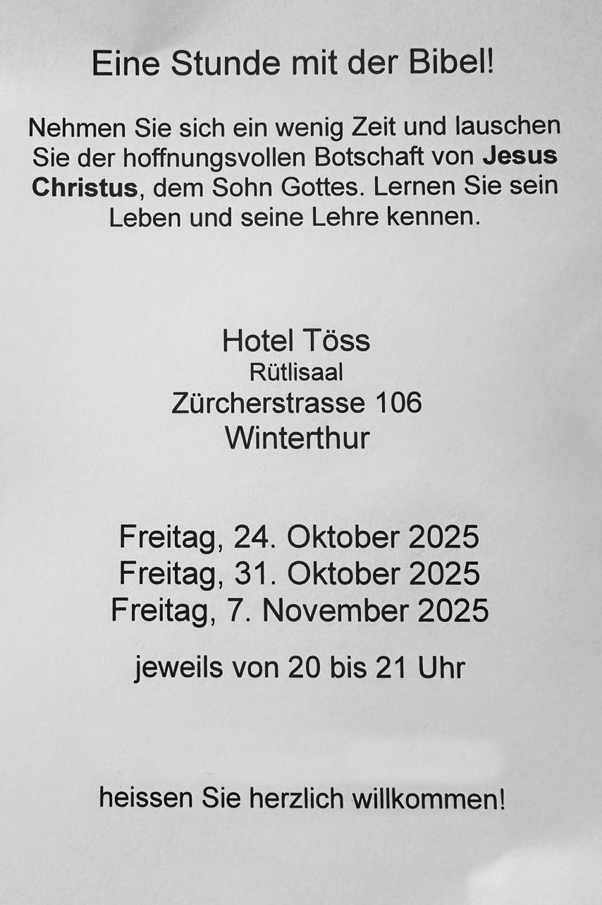 Nicht mit dem Glanz der «Ersten Liebe Kirche» mithalten kann ein schlichtes weisses Flugblatt, zwar weniger glamourös, dafür mit einer klaren Botschaft: «Eine Stunde mit der Bibel!», heisst es da. Die beiden Herren, welche zum gemeinsamen «lauschen der hoffnungsvollen Botschaft von Jesus Christus» einladen, haben im Herbst 2025 gleich dreimal den Rütlisaal im Hotel Töss reserviert. Einen Hinweis auf eine Gemeinde oder ähnliches suchen wir vergebens. Für den Experten aber ein klarer Fall: «Diese Organisation kennt man unter anderem unter dem Begriff der «Namenlosen». Ein christlich-fundamentalistische Sekte.» Hier würden gleich diverse typische Sektenmerkmale erfüllt wie beispielsweise Kritikverbot oder Exklusivität: «Sie lehnen jede Zusammenarbeit mit anderen Kirchen ab und sind nicht Teil der Freikirchenszene, auch wenn sie historisch aus dieser herausgewachsen sind.»